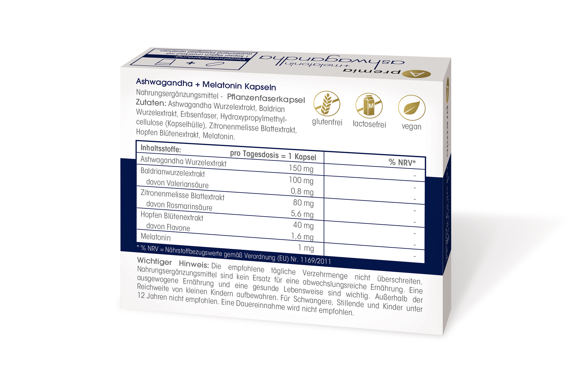 Ashwagandha Wurzelextrakt, Baldrian Wurzelextrakt, Erbsenfaser, Hydroxypropylmethylcellulose (Kapselhülle), Zitronenmelisse Blattextrakt, Hopfen Blütenextrakt, Melatonin.